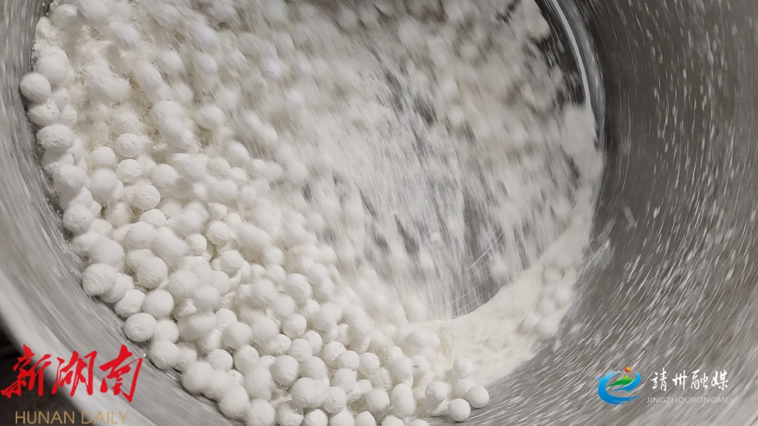 走进城区一家烘焙门店,面点师傅动作娴熟,将馅料沾水,放入盛有糯米粉的机器中反复滚动,直到馅料裹足了层层糯米粉并滚成圆球状,手工元宵便制作完成。