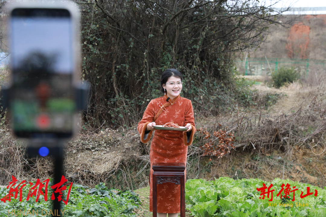 (喻文晗正在拍摄衡山风味土特产推介视频)