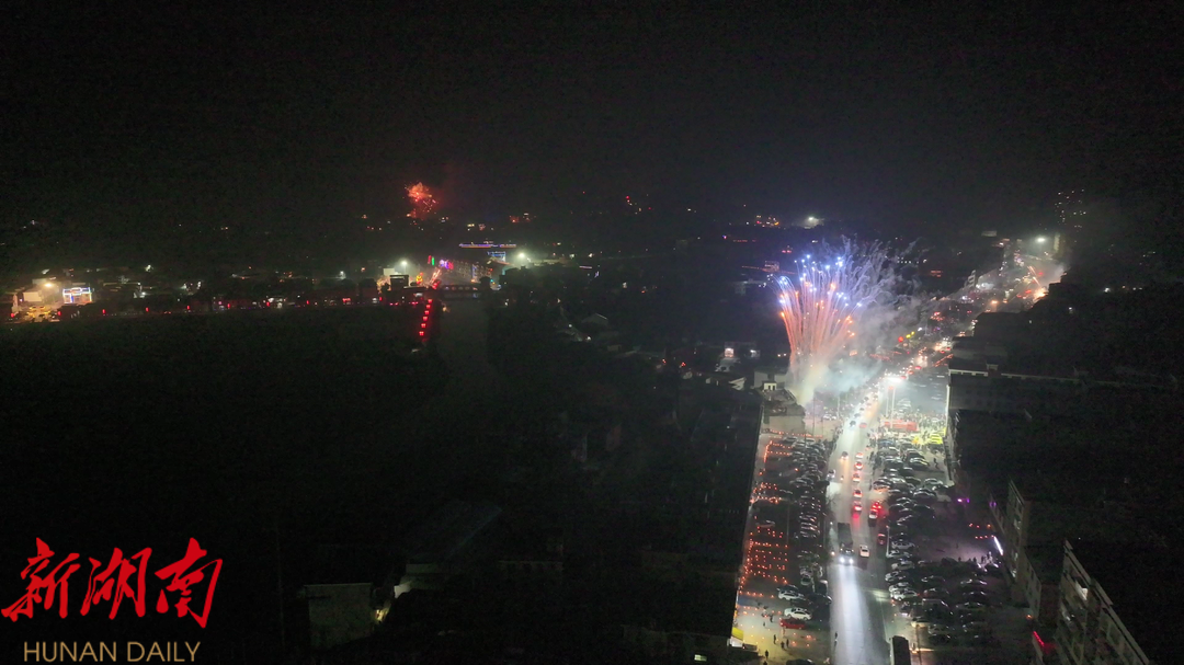 2月12日晚,在永兴县高亭司镇油市村,该村元宵“倒灯”活动开始。家家户户灯火通明,人们敲锣打鼓、高举“草龙”走村串户,喜闹元霄,祈求新的一年风调雨顺,五谷丰登。