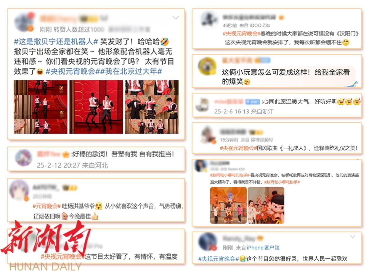 2月12日,中央广播电视总台《2025年元宵晚会》圆满播出,在“欢乐吉祥、喜气洋洋”的主基调中,尽显千灯璀璨、喜庆欢腾的节日景象。#元宵晚会好看# #哪吒敖丙上元宵晚会了#等168个 话题登上全网热搜榜,网友评论“看着总台元宵晚会,还是好有过年feel”“舞台美,音乐好听,设计有传承有新意”“心同此愿温暖大气”……乙巳蛇年第一个“非遗版”春节,从总台春晚到元宵晚会,中华文化的深厚底蕴和创新表达不仅给海内外受众带来欢乐和温暖,也成为世界了解中国的重要窗口。