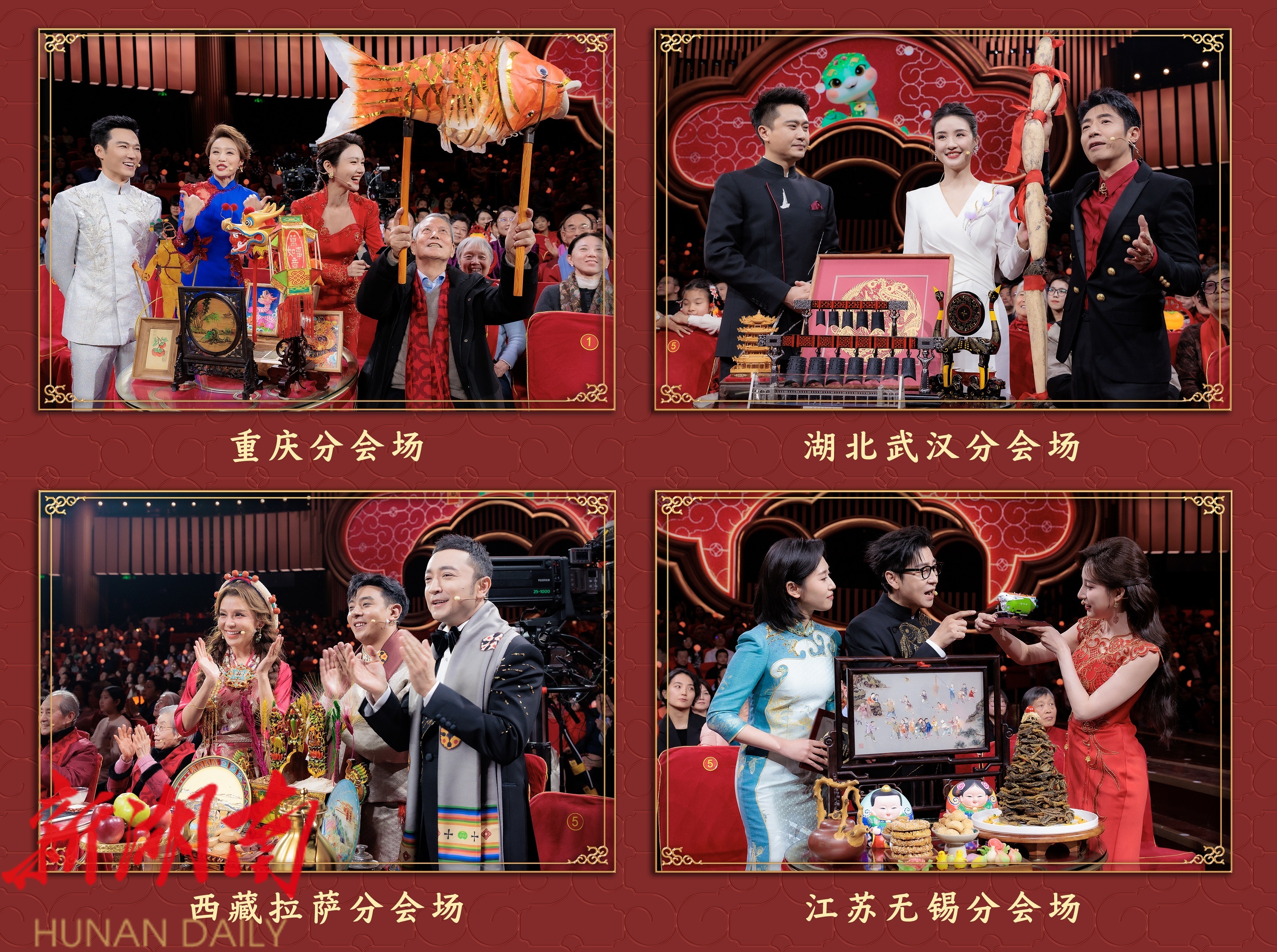 重庆的大足鲤鱼灯、巫山三峡皮影,武汉的编钟、剪纸,西藏的泽帖尔、藏香,无锡的精微绣、紫砂壶,以及各地的非遗技艺等也亮相晚会,为全国人民送上极具地域特色的元宵祝福。