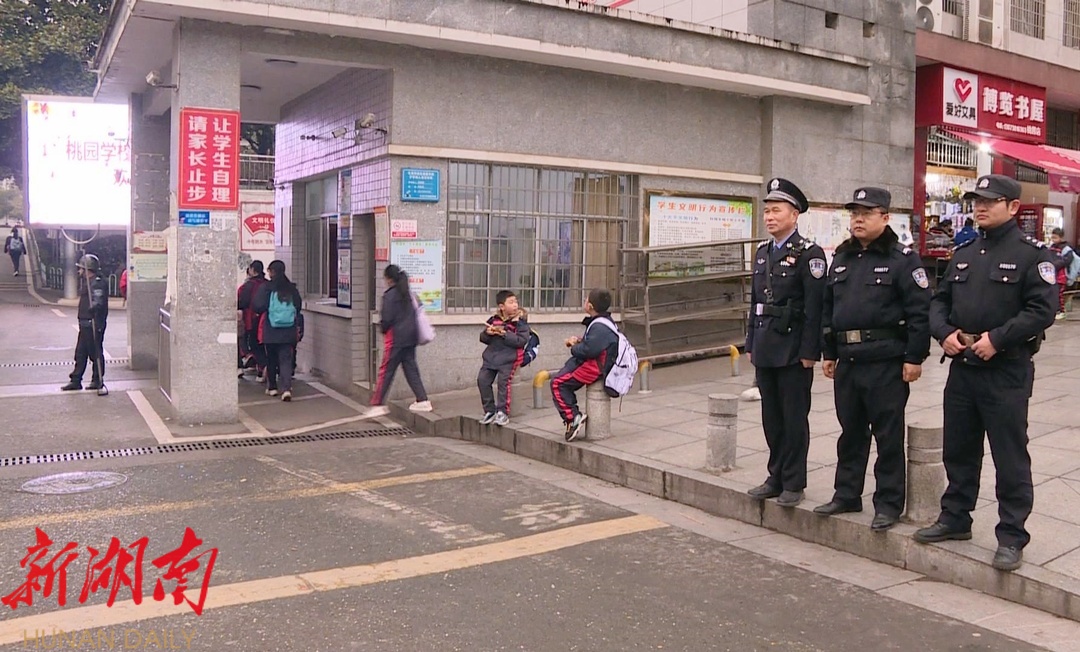 早上7时许,学生们陆续来到学校,校园里顿时热闹起来。在桃园学校门口,市公安局沙塘湾派出所集中社区警务室的民警鄢汉周准时来“报到”,开始了认真细致的巡逻防控。他提醒孩子们注意安全,并对进入校园的人员进行仔细询问、登记,严格把好校园入口关。