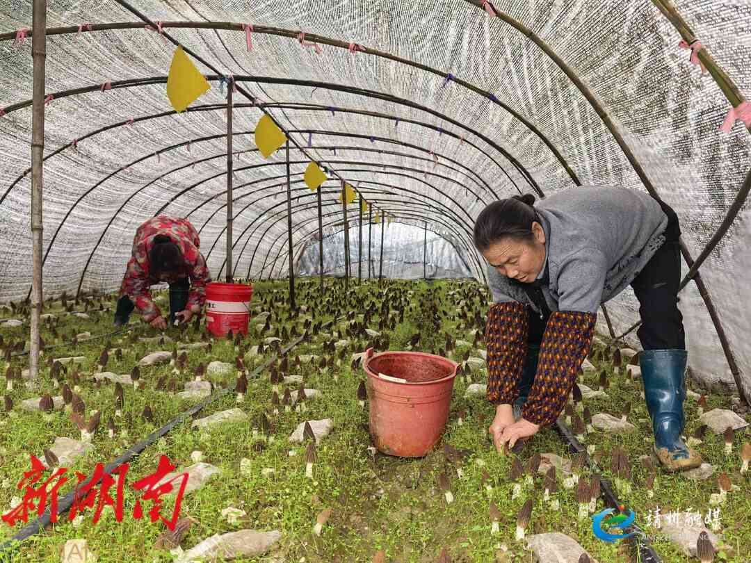 在该村羊肚菌种植基地的温室大棚内,一朵朵羊肚菌破土而出,白色的菌柄撑起褐色的“伞盖”,长势喜人。村民们提着桶子、手拿小刀,穿梭在菌垄间,脸上满是丰收的喜悦。