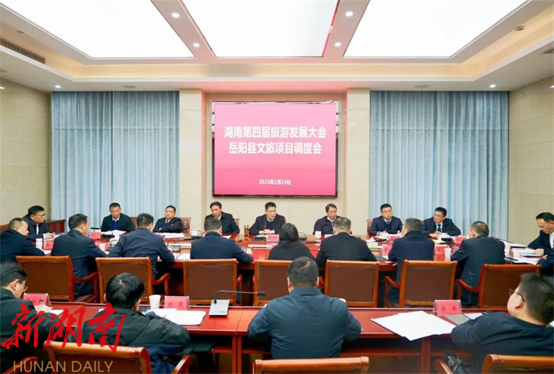湖南日报·新湖南客户端2月15日讯(通讯员 熊佳 周星亮) 2月14日,岳阳县召开湖南第四届旅游发展大会岳阳县文旅项目调度会。县委书记肖湘晖出席并讲话,他强调,要深入贯彻落实省委、省政府,市委、市政府部署要求,认真落实第四届湖南旅游发展大会“奋战一百天”省市联合推进会议精神,进一步增强紧迫感和责任感,高品质打造旅发大会岳阳县文旅项目,持续擦亮“天下洞庭·淳美巴陵”文旅品牌。县委副书记、县长吴光文主持会议,县领导周里、张哲君、胡海平、张文毅、续广宁及相关部门和乡镇负责人等参加。