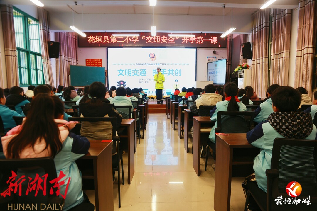 2月17日,花垣县公安局交通管理大队法宣中队联合治安大队走进花垣县第二小学,开展以“文明交通、携手共创”为主题的交通安全“开学第一课”宣传活动,为师生们送上了一份实用的交通安全知识“大礼包”。