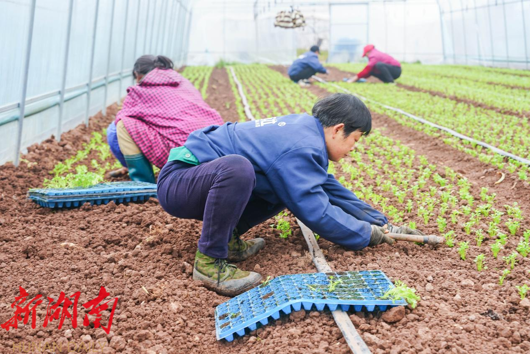 湖南华达田园生态农业股份有限公司的工人在大棚里栽种芹菜苗