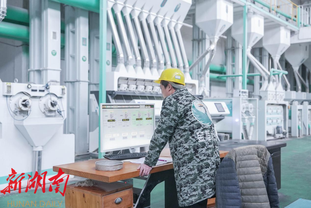 金雁粮食购销有限公司的工人通过操作智能化设备对大米进行加工