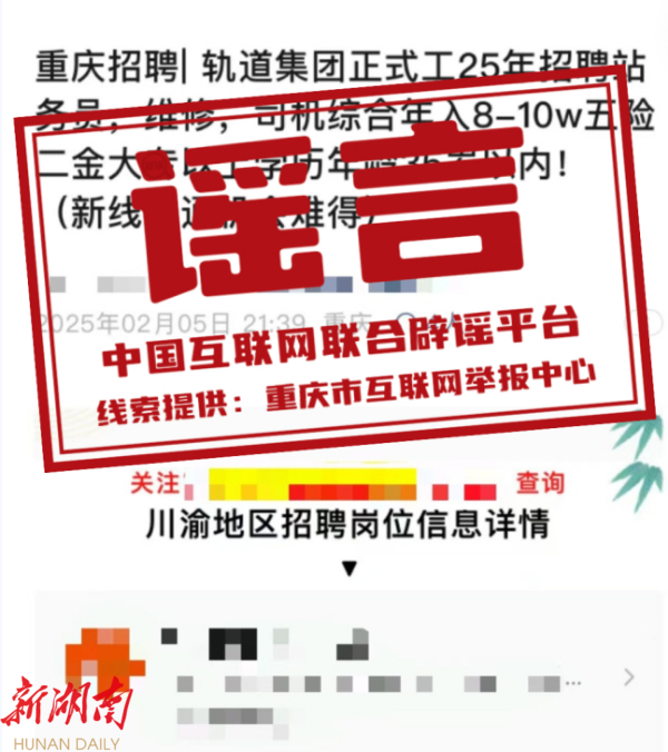 真相: 近日,关于“重庆轨道集团招聘站务员、维修工、司机”的信息在网络中流传,该信息以“新线开通机会难得”为噱头,称“重庆轨道集团招聘站务员、维修工、司机岗位,其中大专以上学历、年龄35岁以下的站务员不限制专业”,并承诺“综合年收入8-10万元”“五险二金”等待遇。对此,重庆轨道集团辟谣称,该招聘信息为虚假内容,该集团所有招聘信息目前仅通过“重庆轨道交通”新浪微博、微信公众号、官方网站(https://www.cqmetro.cn/)及“渝畅行”App四个官方渠道发布,并且重庆轨道集团官方网站是唯一招聘渠道。该集团提醒,有应聘意向的求职者,可关注以上官方平台,切勿轻信他人,以免上当受骗。(来源:“重庆辟谣”微信公众号)