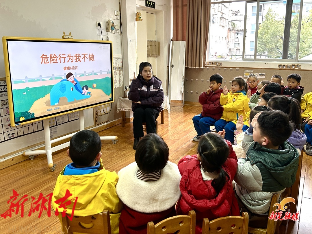 在县幼儿园总园大二班教室里,老师正以《危险行为我不做》为主题,采用PPT图文展示、互动小游戏、真实案例分析、知识抢答、播放《安全歌》教育宣传短片等方式,围绕识别哪些是危险行为、学习避免危险行为的方法等方面内容,给小朋友们带来了精彩有趣又极具教育意义的开学第一课,有效引导幼儿如何正确对待危险行为,进一步培养幼儿自我保护的意识和能力。