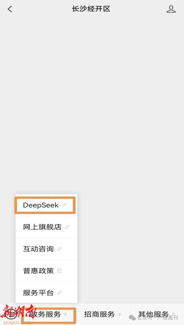 从现在起,打开长沙经开区官方微信公众号,在“政务服务”栏目,可以看见“DeepSeek”选项,点进去后就可以正式开启DeepSeek深度体验了。