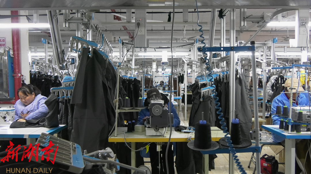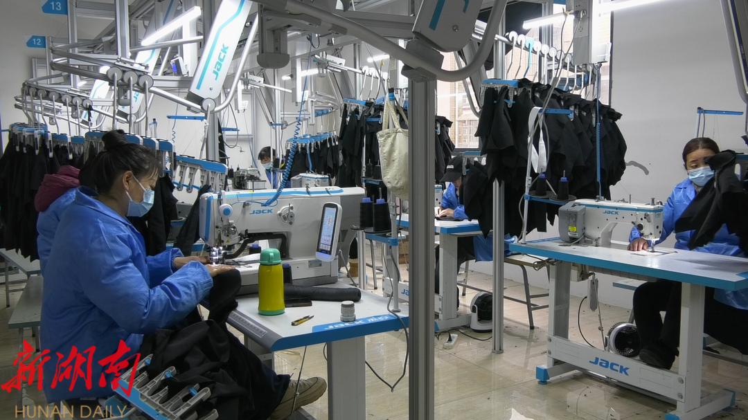 新湖南客户端2月18日讯(记者 杨秀知)新春伊始,万象更新。湘西土家族苗族自治州古丈县的服装企业陆续复工复产,工人们干劲十足,全力冲刺一季度“开门红”。2月18日,在古丈吉盛服饰有限公司生产车间,一台台缝纫机高速运转,顶部的全自动吊挂设备在工位两旁传输着服装裁片,工人们熟练地操作着设备,裁剪、缝制、熨烫等一道道工序有条不紊地进行着,一件件成衣在生产中逐渐成型,包装分销到全国各地。