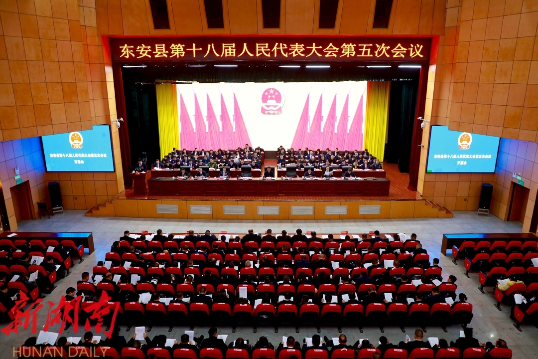 新湖南客户端2月18日讯(通讯员 唐游光 易恒戬 陈俊宏 庾先文)2月18日上午,东安县第十八届人民代表大会第五次会议在东安会堂隆重开幕。来自各条战线的县人大代表肩负着全县人民的重托,以饱满的政治热情出席大会,履行宪法和法律赋予的神圣职责,共商东安县发展大计。