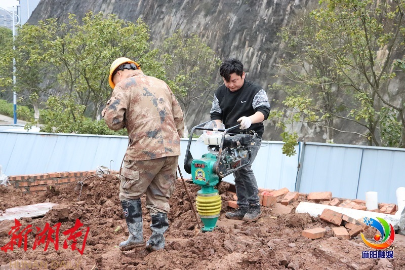 2月19日上午,记者走进麻阳米墅清淼温泉康养项目施工现场,工程负责人与建筑工人正交流项目规划建设方案,大家按部就班、有条不紊地开展铺砖、拉线、测量等前期工作,多台大型机械设备火力全开,挖土机与渣土车的轰鸣声交相辉映,整个施工现场热火朝天。