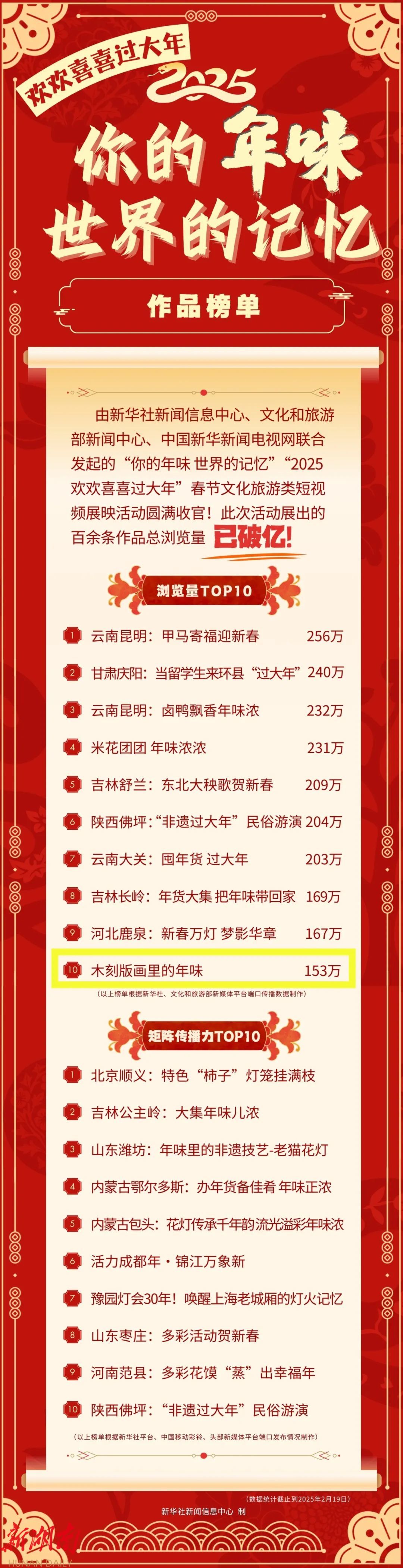 湖南日报·新湖南客户端2月21日讯(记者 胡苗) 2月20日,记者从新华社新闻信息中心获悉,由新华社新闻信息中心、文化和旅游部新闻中心、中国新华新闻电视网联合发起的“你的年味 世界的记忆”“2025欢欢喜喜过大年”春节文化旅游类短视频展映活动圆满收官。此次活动共展出百余条作品,总浏览量破亿!其中,永定区融媒体中心 的作品《木刻版画里的年味 》以153万的浏览量成功上榜浏览量TOP10 。