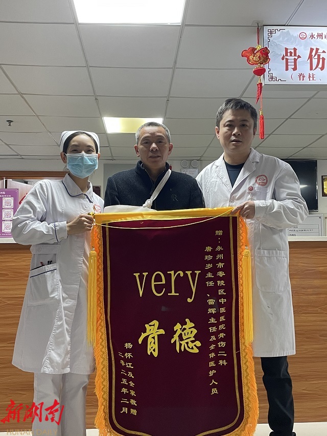 湖南日报·新湖南客户端2月21日讯(通讯员 纪 芬 )“要不是遇到您,我这肩膀恐怕这辈子都好不了了,太感谢您了!”2月19日,零陵区中医医院骨伤二科迎来了一位特殊的患者。在家人的陪同下,患者杨伯伯激动地将一面印有“Very 骨德”的锦旗,亲手送到科室副主任雷辉手中,以此表达内心满满的感激之情。