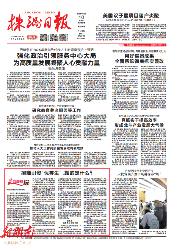 蛇年首个工作日,湖南招商引资工作座谈会召开。株洲高新区在会上作经验交流发言。这是对株洲高新区招商引资工作的高度肯定。数据显示,株洲高新区2023年至2024年累计引进项目109个,引资规模突破400亿元,项目履约率达100%。
