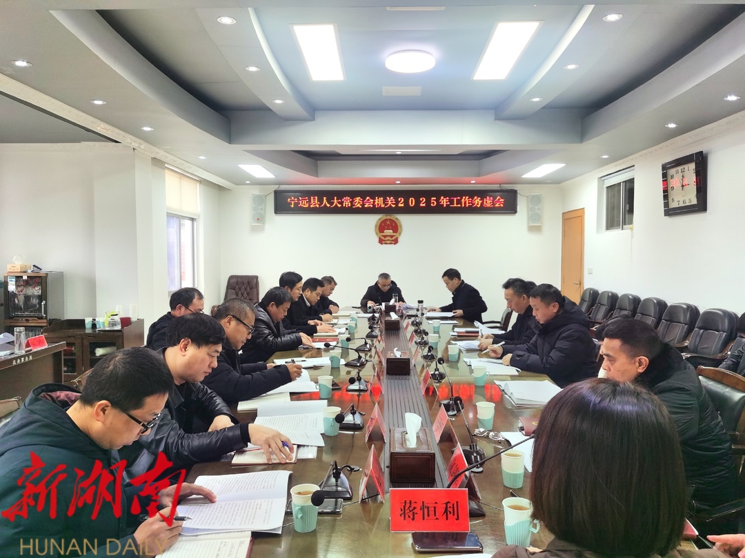 会议强调,务虚的目的是为了更好地务实。 2025年是全面完成“十四五”规划的收官之年,是“十五五”规划的谋划之年,是进一步全面深化改革的关键之年。 县人大常委会2025年工作的主基调是“大抓落实”。 要理清思路,找准人大工作的 “位”与“责”。 紧跟县委决策部署,紧贴人民群众所需所盼,突出抓好省“三会三文”的贯彻落实,聚焦“全力打造永州南部经济发展轴区域中心城市”战略目标, 把宪法法律赋予人大的职权依法行使好,把制约人大事业发展的难点堵点有效破解好,切实将人民代表大会制度优势转化为治理效能。 要明确重点,提升推动落实的“绩”与“效”。 按照“规定动作不走样,自选动作有特色”工作思路, 采取“一聚焦、三围绕、六化”工作举措 (即聚焦主责主业, 围绕中心任务、群众关切、法规实施,通过实行任务清单化、标准模板化、操作手册化、推进图表化、落实机制化和督导常态化 ) ,进一步做实、做深、做细人大工作。发挥人大代表主体作用,深化拓展“两个联系”工作,不断激发代表履职活力。充分发挥人大监督职能,寓支持于监督之中 ,确保经济体制改革各项工作落实到位。 要强化保障,凝聚干事创业精气神。 锚定“四个机关”定位,健全完善工作制度,抓好人大队伍建设,牢固树立“马上就办,办就办好”工作理念,雷厉风行抓落实,统筹把握时度效,提高工作能力,创新工作方式,务实工作作风,一以贯之写好新时代人大工作高质量答卷,为 奋力推动中国式现代化宁远实践作出新的更大贡献。