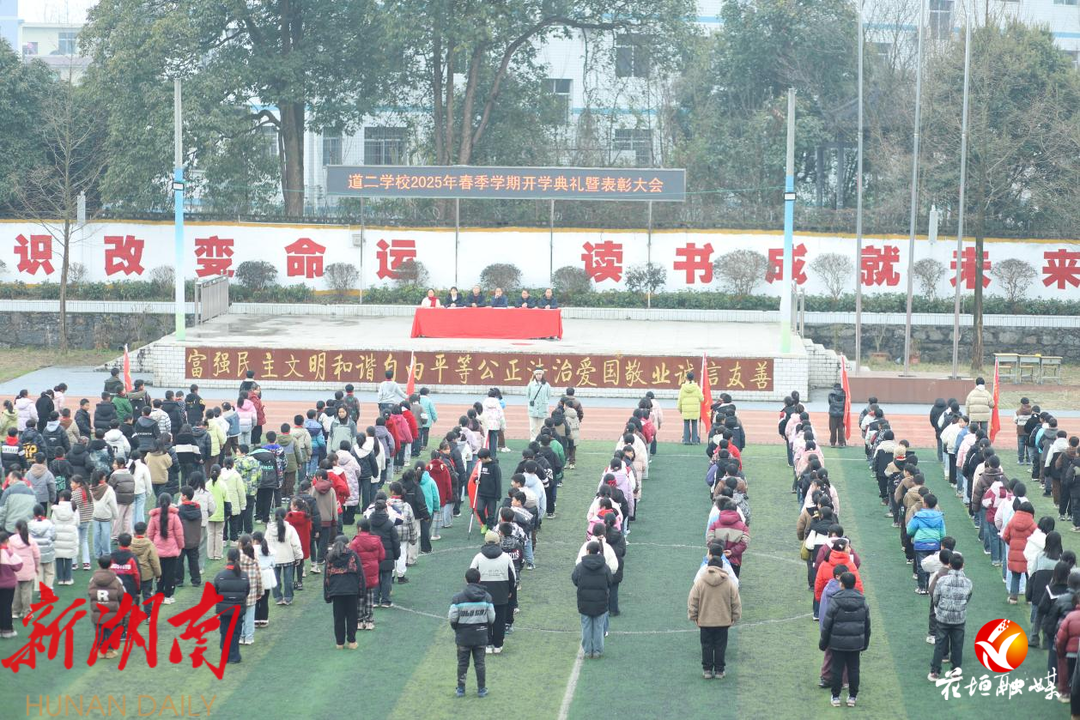 2月21日,花垣镇道二九年一贯制学校学生全体师生齐聚校园,举行2025年春季开学典礼暨表彰大会。