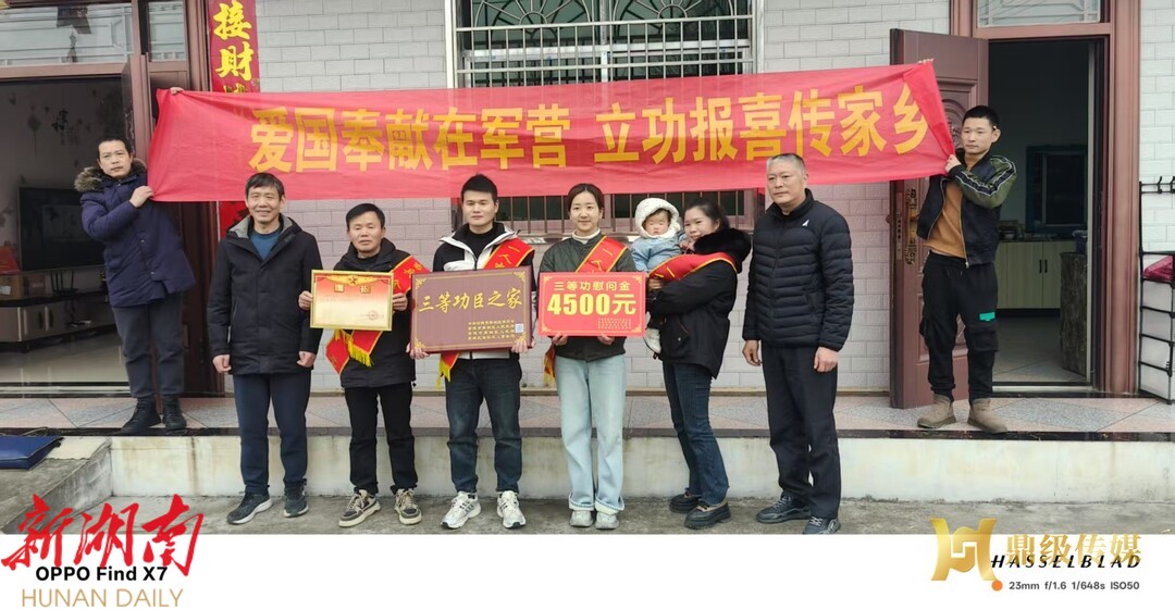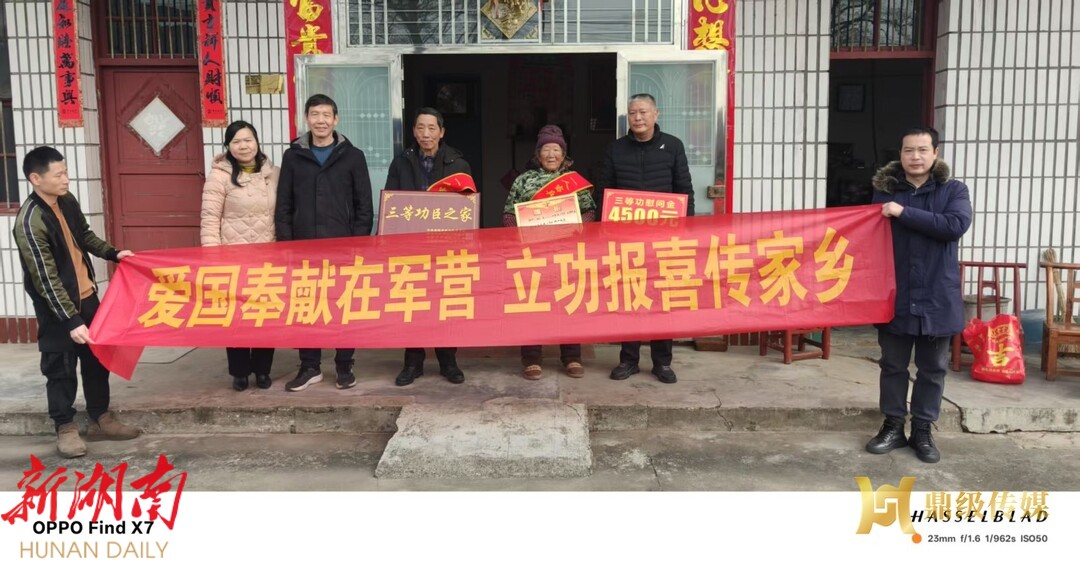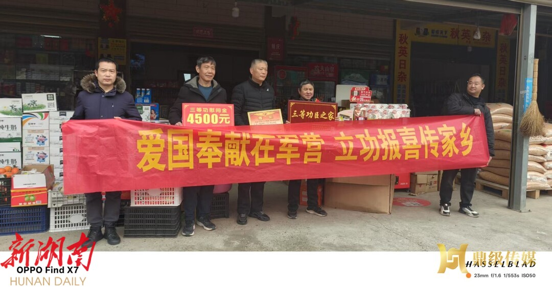 湖南日报·新湖南客户端 2月25日讯(通讯员 郭作军)2月25日,鼎城区退役军人事务局联合牛鼻滩镇退役军人服务站开展“送喜报上门” 活动,为该镇荣立三等功的3名现役军人家庭举行庄重仪式。锣鼓喧天、鞭炮齐鸣中,工作人员为军属佩戴绶带,颁发立功喜报及慰问金,并详细询问生活状况,感谢他们为国防事业培养人才。军属们难掩自豪,表示将全力支持子女在部队服役,争取再立新功。