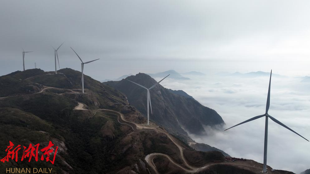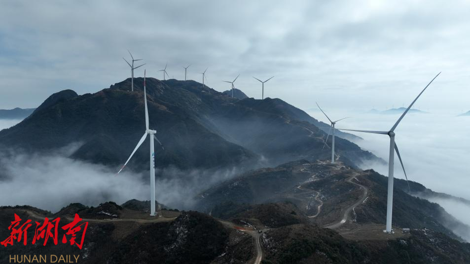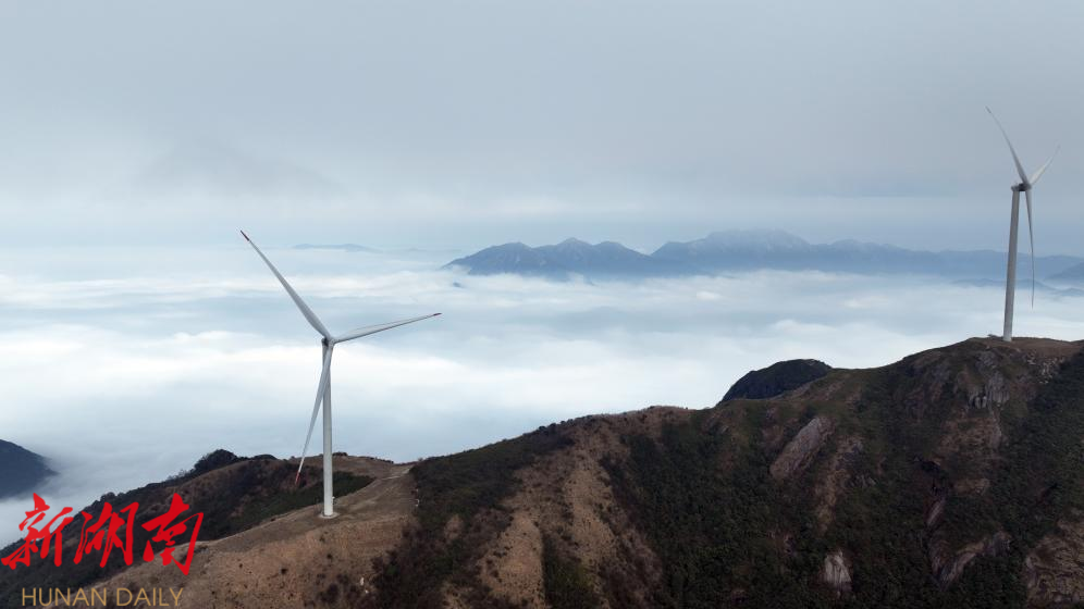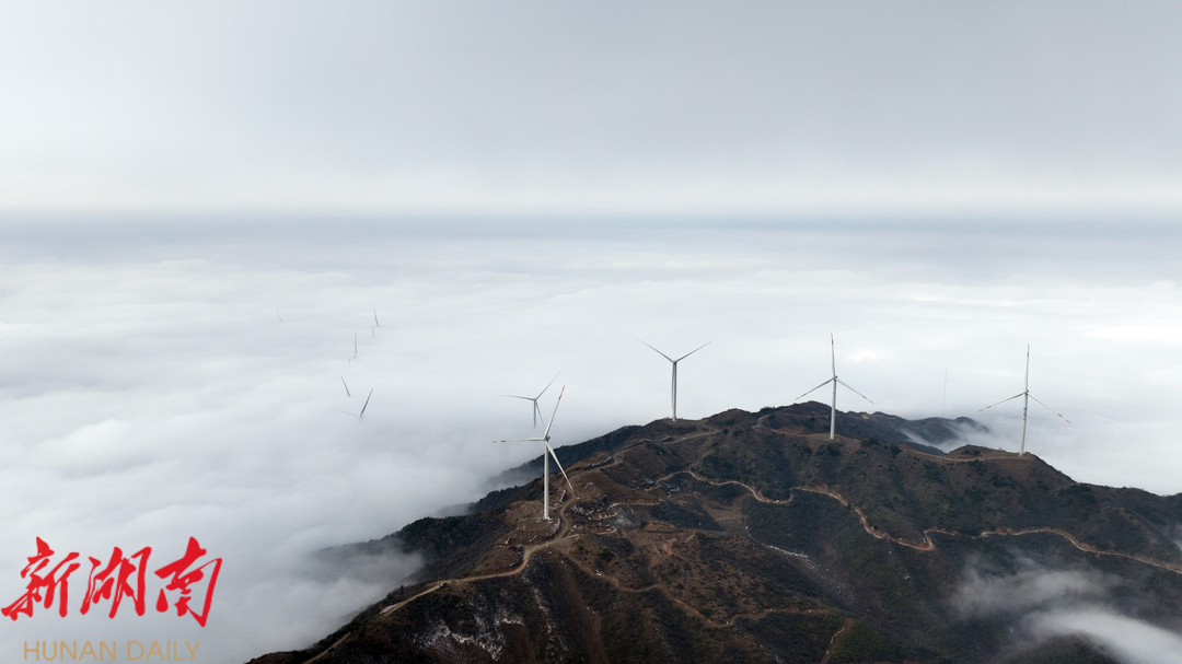 湖南日报·新湖南客户端2月25日讯(通讯员 李严军 蒋李臻 廖芷谊) 2月24日,受冷空气影响,宁远县仙子山出现壮美的云海景观。云海在山巅翻腾涌动,风力发电机组在缥缈的云雾中若隐若现,处于风口的山头出现雾凇景观,银装素裹的树木与风电、云海交相辉映,构成一幅美丽画卷。