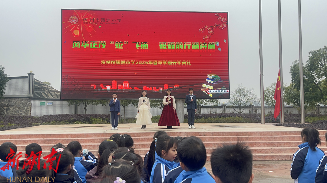 湖南日报·新湖南客户端2月25日讯(通讯员 谢乾瑶 ) 2 月 24 日 ,永州市蘋洲小学举行了以 “ 风华正茂 ‘ 蛇 ’ 飞扬,砥砺前行谱新篇 ” 为主题的春季开学典礼,为新学期拉开了序幕。