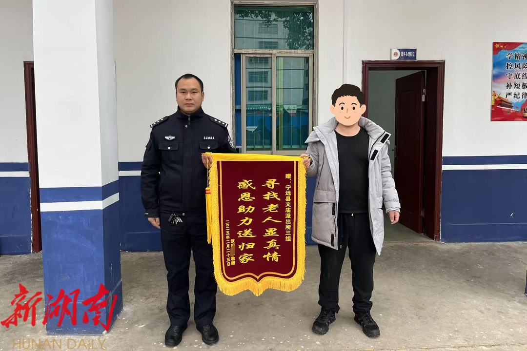 湖南日报·新湖南客户端2月26日讯(通讯员 刘孟娟) “谢谢你们,非常感谢你们!”2月25日上午,宁远县公安局文庙派出所收到居民欧阳先生送来的一面锦旗,上面写着“寻找老人显真情 感恩助力送归家”,对民辅警帮助寻回走失老人表达由衷的感谢。