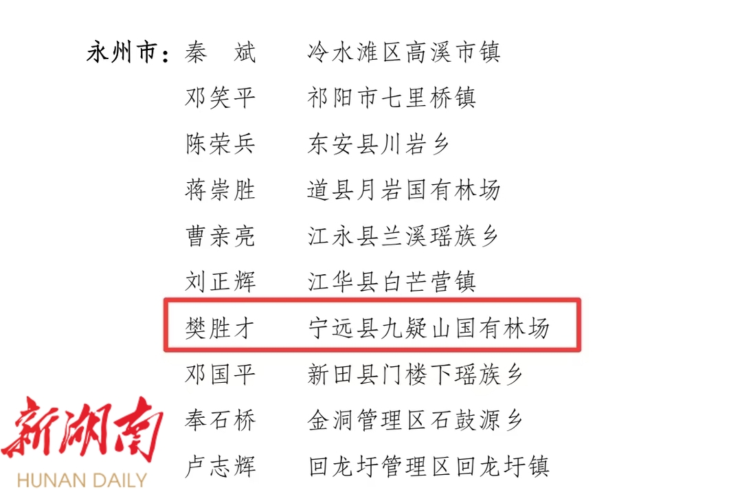 湖南日报·新湖南客户端2月26日讯(通讯员 宁新综) 近日,湖南省林长制工作领导小组办公室发布《关于对2024年度林长制工作成效明显地区予以表扬奖补的通报》《关于表扬2024年度湖南省生态护林员标兵的通报》,对全省林长制工作成效明显地区、全省生态护林员标兵进行通报表扬。其中,鲤溪镇荣获全省林长制工作成效明显地区(乡级),九疑山国有林场护林员樊胜才被评为全省生态护林员标兵。