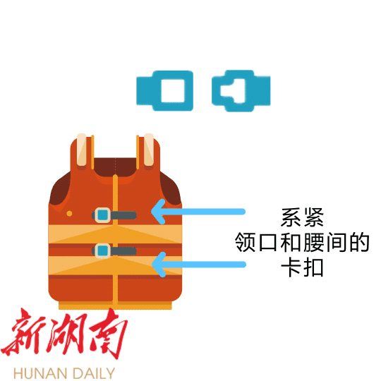 将救生衣 领口和腰间的卡扣系紧, 如果是绳索的话,必要时要打死结,防止被波浪冲开。