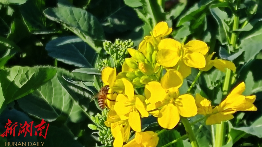 油菜花田不仅扮靓了乡村,还吸引了不少 “小访客”。成群的蜜蜂在花丛间忙碌飞舞,它们穿梭于花蕊之中,采集着花蜜,嗡嗡的振翅声为这片花海增添了灵动的音符。