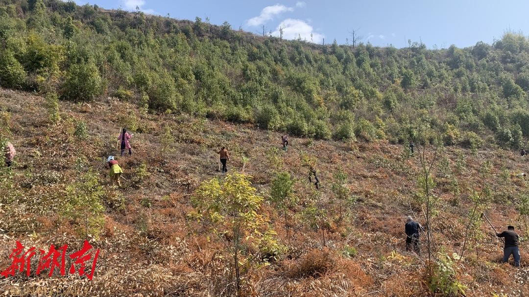 在舂陵江陶源村流域,沿岸山坡上一片热火朝天的景象。县林业局工作人员与当地群众手持锄头等工具,按照技术指导,有序进行挖坑、栽树、填土等工作。大家分工合作,把一棵棵树苗稳稳植入土地,在舂陵江畔“安家落户”。