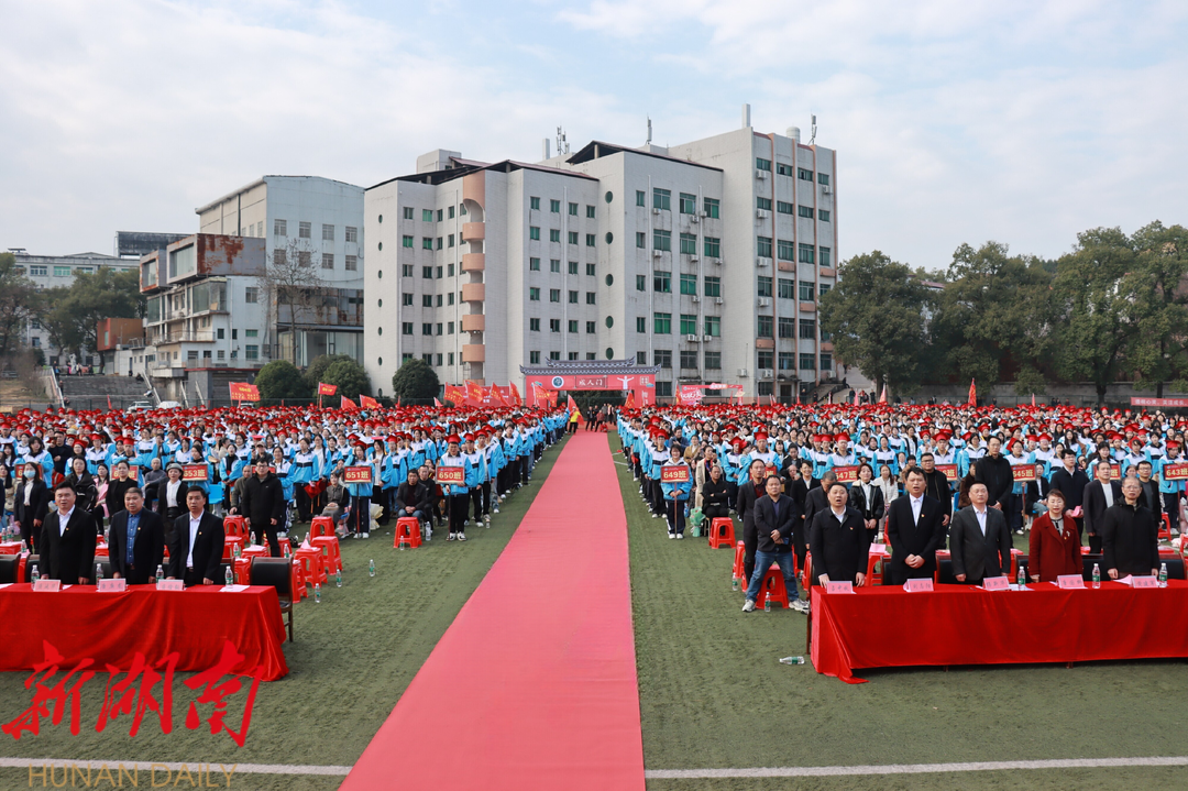 湖南日报·新湖南客户端2月28日讯(通讯员 周晓亮 黄艳辉)2月28日,永州三中举办了以“十八而志,青春起航”为主题的2025届成人礼暨高考百日誓师大会,旨在加强对青年学生的感恩教育、礼仪教育,增强他们的社会责任感和使命感,引导他们树立正确的价值观。零陵区教育局相关负责人、该校党委班子成员出席活动。