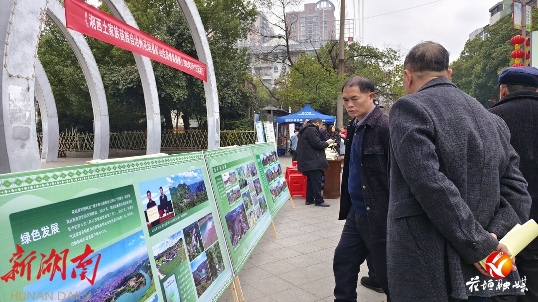 郁郁葱葱的边城公园,是花垣县的“城市氧吧”。今天,人们在公园里一边畅享生态文明之美,一边踊跃学习生态法治建设的新成果——《湘西土家族苗族自治州花垣县矿山生态修复条例》。县直有关部门给市民送上3000余份《条例》手册,精心布置矿山生态修复成果展,让市民朋友看得入心入脑。