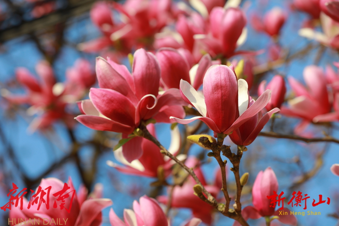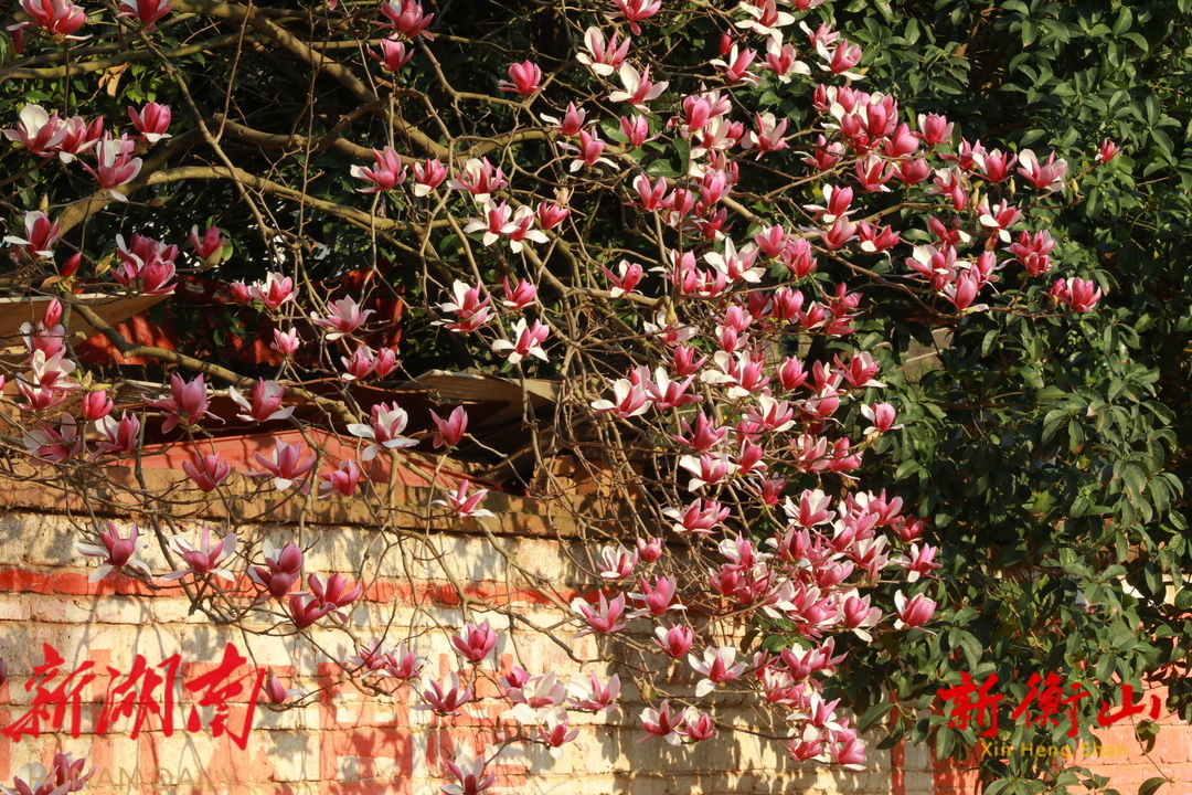 “风动暗香浓,始知玉兰开。”近日,记者在衡山县长江镇石桥铺社区一居民家的院墙外偶遇一抹“春色”,满树玉兰花已在枝头悄悄展现美貌,嫣红与纯白交织,如同云霞,缤纷绚烂。