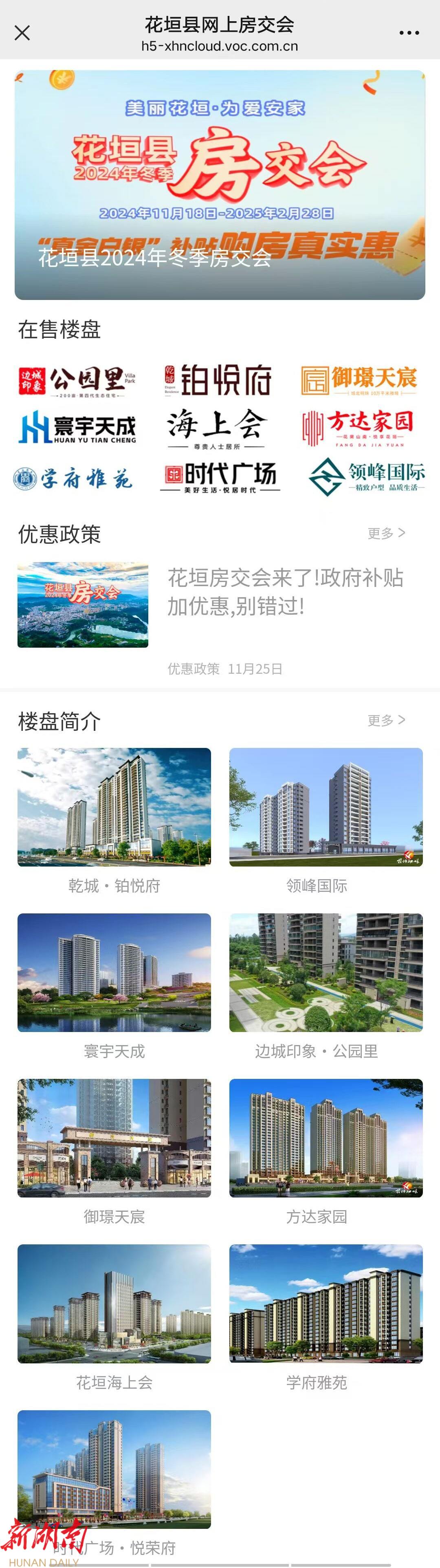 本届房交会采取线上线下相结合的方式,全方位展示花垣县房地产市场的活力与潜力。线上房交会于2024年11月18日通过“新花垣”微信公众号、“新花垣”App等平台上线推广,主办方还在活动期间创新推出了“探盘直播”活动,吸引大量网友关注和参与。线下活动则于2025年1月2日正式启动,9家参展企业携1000余套品质房源亮相,共同描绘花垣宜居宜业的幸福图景。