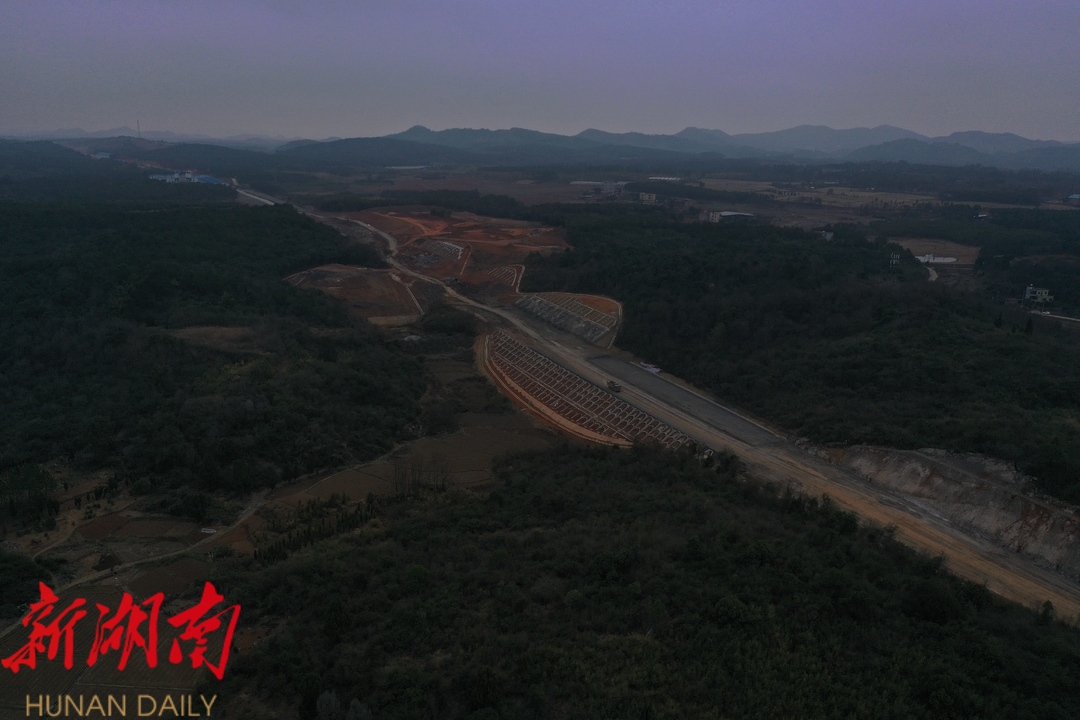 桂新高速桂阳段项目建设自2023年12月动工,道路起点自我县舂陵江镇,终点至永州市新田县大坪塘镇。建设工期为24个月,按双向4车道高速公路标准,设计速度120km/h,路基宽度26.5米。目前,12公里路基基本完工,正在进行土石方施工,后续将进行路面水稳层铺设。