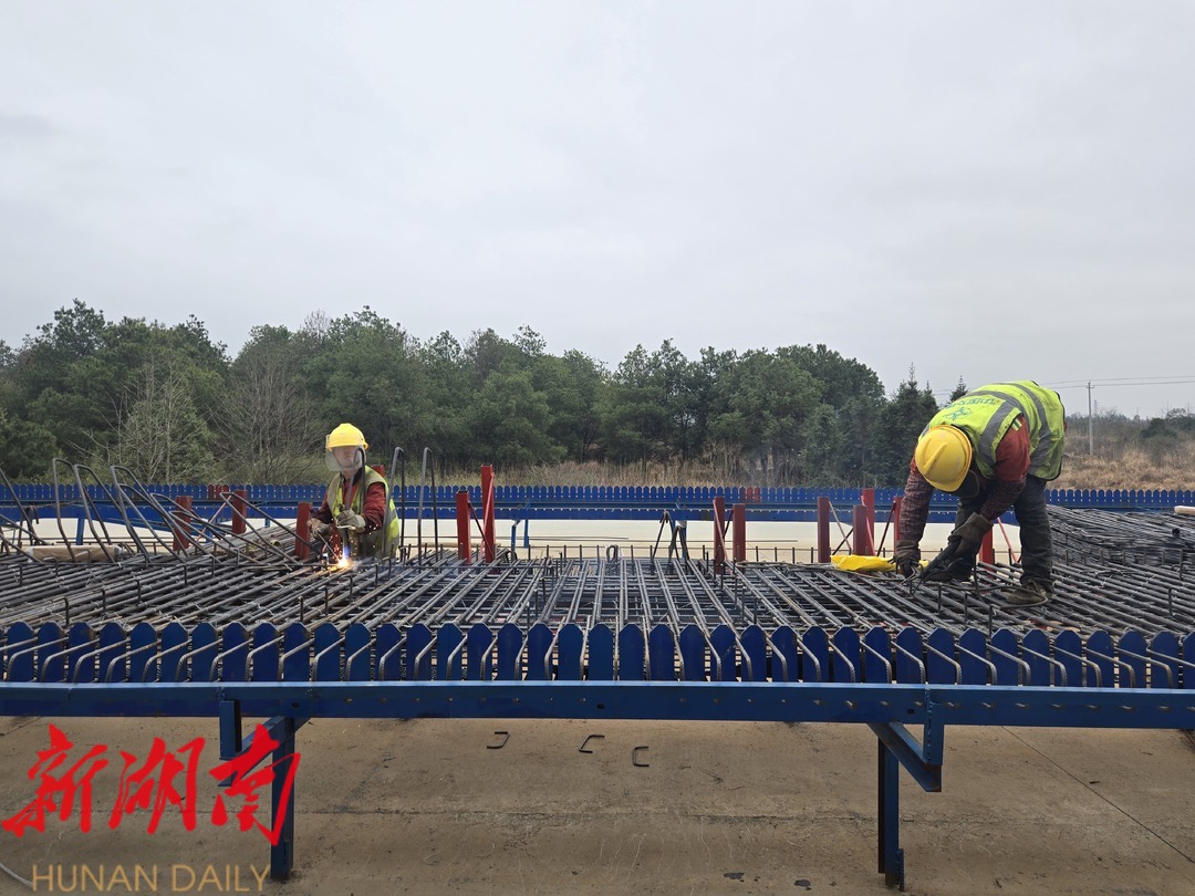 在我县舂陵江镇,桂新高速桂阳段施工队正在忙着桥梁T梁预制。T梁预制实现工厂化生产,工人进行钢筋绑扎、电焊焊接后,由起重机械进行T梁模板安装,经混凝土浇筑、张拉、压降后,一片T梁预制完成。桂新高速桂阳段路线总长15.88km,架设桥梁18座,桥梁总长4.9km。全年需生产T梁1424片,当前工程一天可以完成6片T梁预制生产。预制生产后的T梁将运往桥梁架构现场进行下构,工人对空隙处进行钢筋焊接,目前桥梁下构进度达50%。