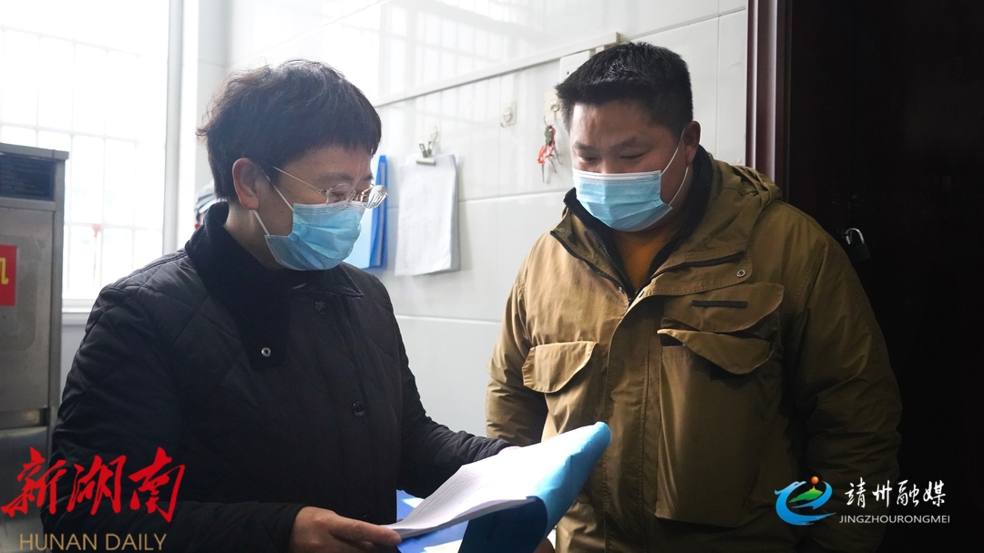 黄忆钢在靖州职业教育总校食堂后厨仔细查看食品供货记录,详细了解校园食品安全工作(蒲湘萍 摄)