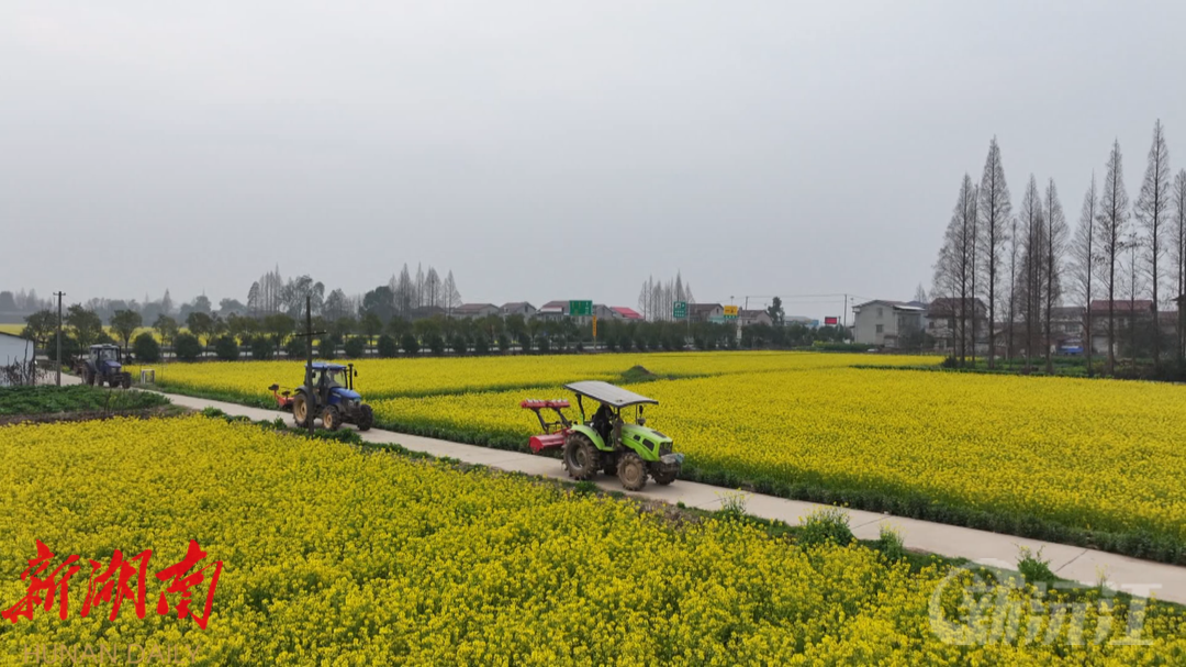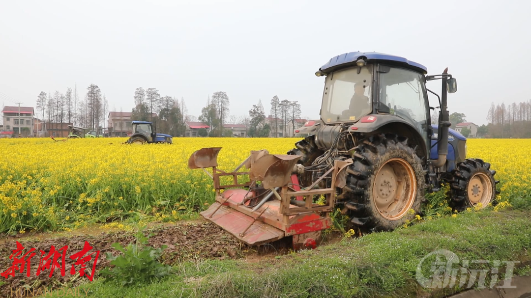 在草尾镇胜天村,去年完成高标准农田建设的灌渠中,春水汩汩注入金黄的田野,种粮大户周波和合作社的农户一起,开着四台旋耕机在农田里一字儿排开,在花海中开始了今年春耕的翻耕作业。