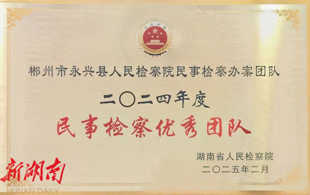 湖南日报·新湖南客户端3月5日讯(通讯员 罗斐瓴)2月27日上午,全省民事行政检察工作会议在长沙召开。会上,对2024年度民事行政检察工作优秀团队和优秀个人进行了表彰通报。永兴县人民检察院民事检察办案团队获评“湖南省2024年度民事检察工作优秀团队”。这也是永兴县人民检察院民事检察工作连续三年收获的又一个省级荣誉。