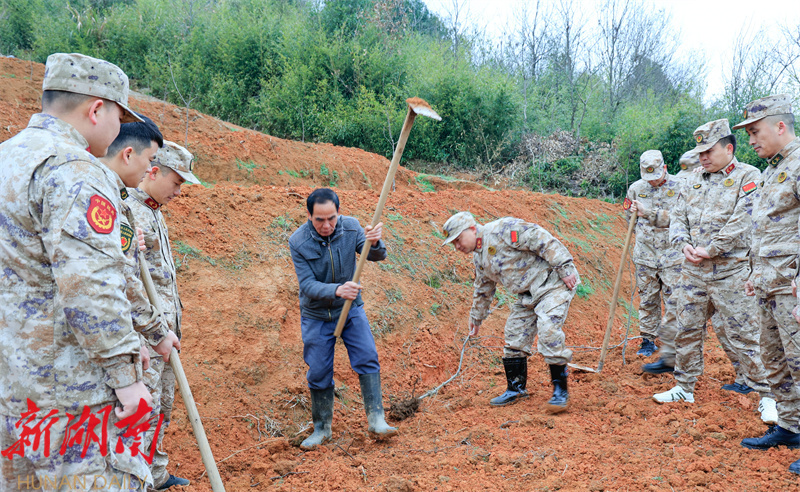 桂阳县民兵乡村振兴服务队队员刘山表示:“当前正值农忙,劳动力较为紧缺,我们协助种植大户抢抓农时移栽南方苹果苗,很有意义,期望能助力他们迎来好收成。”