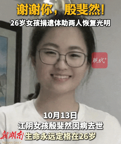 2024年10月13日,江苏江阴,26岁的殷斐然因病去世,家人将其遗体和角膜捐献。家人称,斐然生前每月都会向联合国儿童基金会捐款,生病时也不曾中断。生病后,她向家人提出了去世后捐献遗体的意愿。