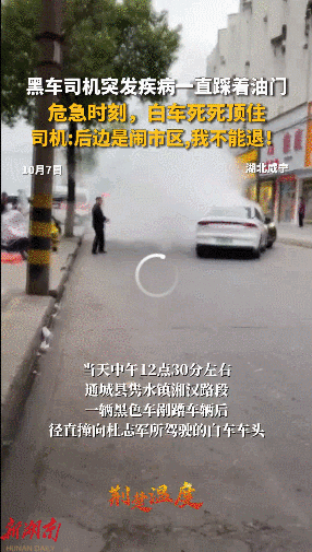 2024年10月7日,湖北通城,一黑色轿车司机突发疾病,脚踩油门失去意识,车辆在闹市区失控,撞向一辆白车。白车司机杜志军意识到状况危急,踩住油门,用车身死死顶住失控车辆。