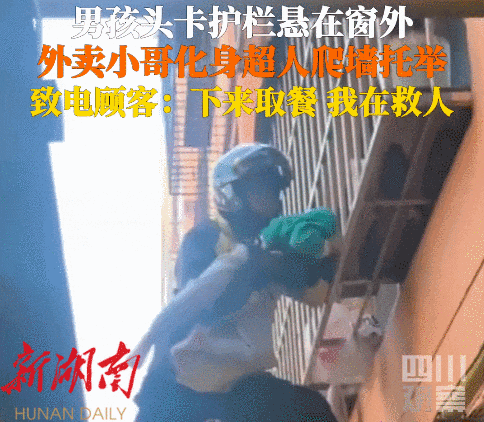 2024年2月16日,辽宁大连,外卖小哥李海涛送外卖时看到一个约5岁的小男孩头卡在2楼外防护栏处,身体悬空不断挣扎,于是他化身“飞天侠”,托举男孩10多分钟,最后成功将小男孩救下。