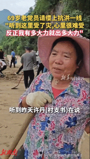 2024年7月22日,陕西汉中,受强降雨影响,陕西汉中市多地被淹。留坝县江口镇洪武村老党员张发秀听说后,主动请缨到受灾严重的玉皇庙镇白庙子村,参与恢复重建工作。
