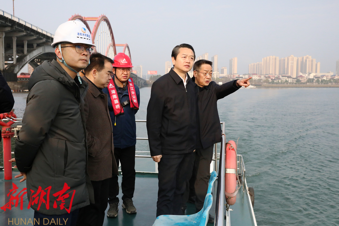 沅水桃源枢纽二线船闸项目已完成全部临时工程建设,正在进行移堤工程堤身填筑、船闸主体基坑开挖。黄伟雄来到施工水域,登上涉水工程船舶,了解水上作业情况。他强调,密切关注水文和天气信息,加强防风防滑等安全措施,保障人员和设备安全;严格落实主体责任,强化内部安全教育,加强施工水域巡查,确保涉水工程施工通航安全。