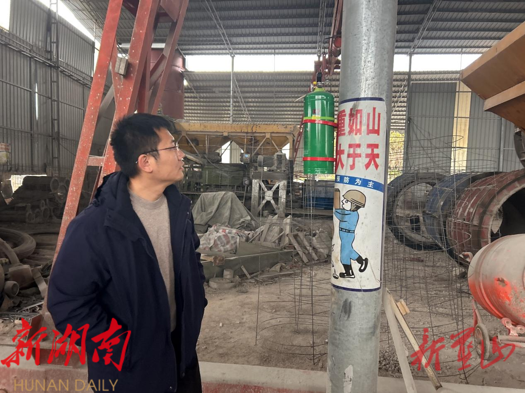 在蓝山县潇航水泥制品有限公司,镇应急管理工作执法人员对企业各生产环节进行全面细致的安全隐患排查,同时对在公司的职工询问是否有买商业保险跟医保,认真检查消防器材是否过期、摆放位置是否安全、安全生产实时监控是否能保存3个月的监控画面、工人在工作时是否佩戴头盔。