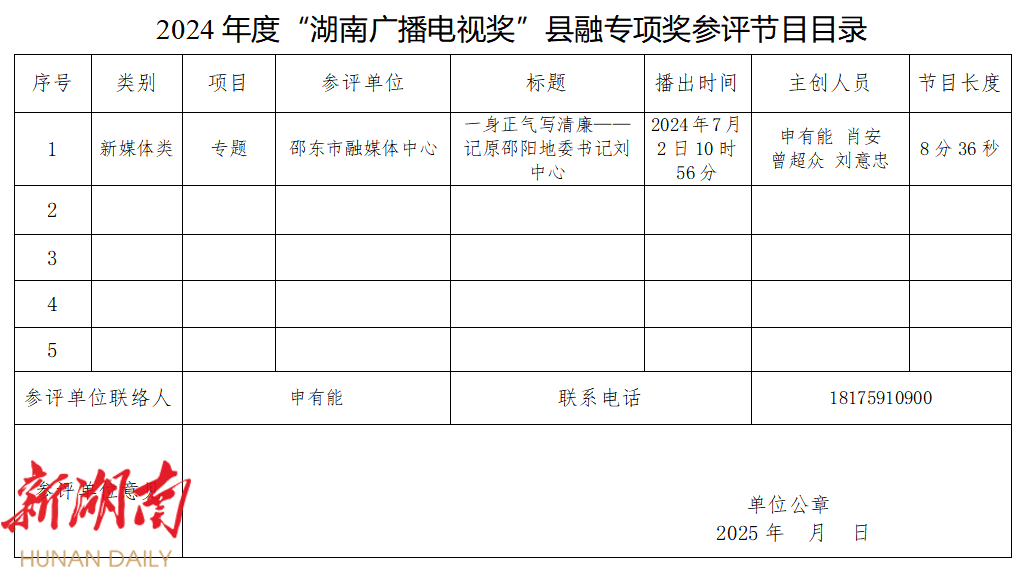 按照《2024年度“湖南广播电视奖”县融专项奖评选方案》的通知要求,现推荐我单位1篇作品参加2024年度湖南广播电视奖评选,现予公示,接受群众评议监督。