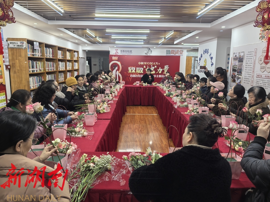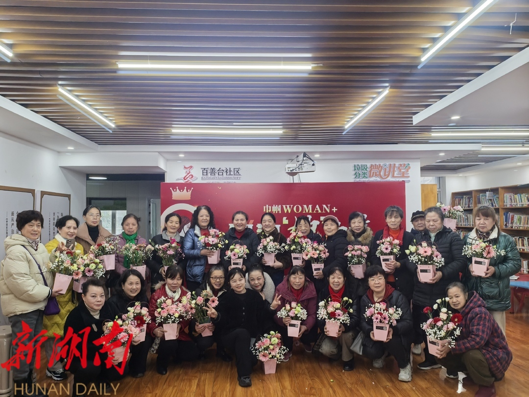湖南日报·新湖南客户端3月7日讯(通讯员 任萱)在国际妇女节前夕,3月7日,开福区湘雅路街道百善台社区巾帼志愿阳光站开展了一场插花艺术活动,为辖区女性送上了一份独特的节日礼物。此次以"巾帼WOMAN+ 致敬她力量"为主题的活动,不仅展现了女性的优雅与创造力,更深化了社区"WOMAN+"(我们家)品牌内涵,传递了女性力量的多维价值。
