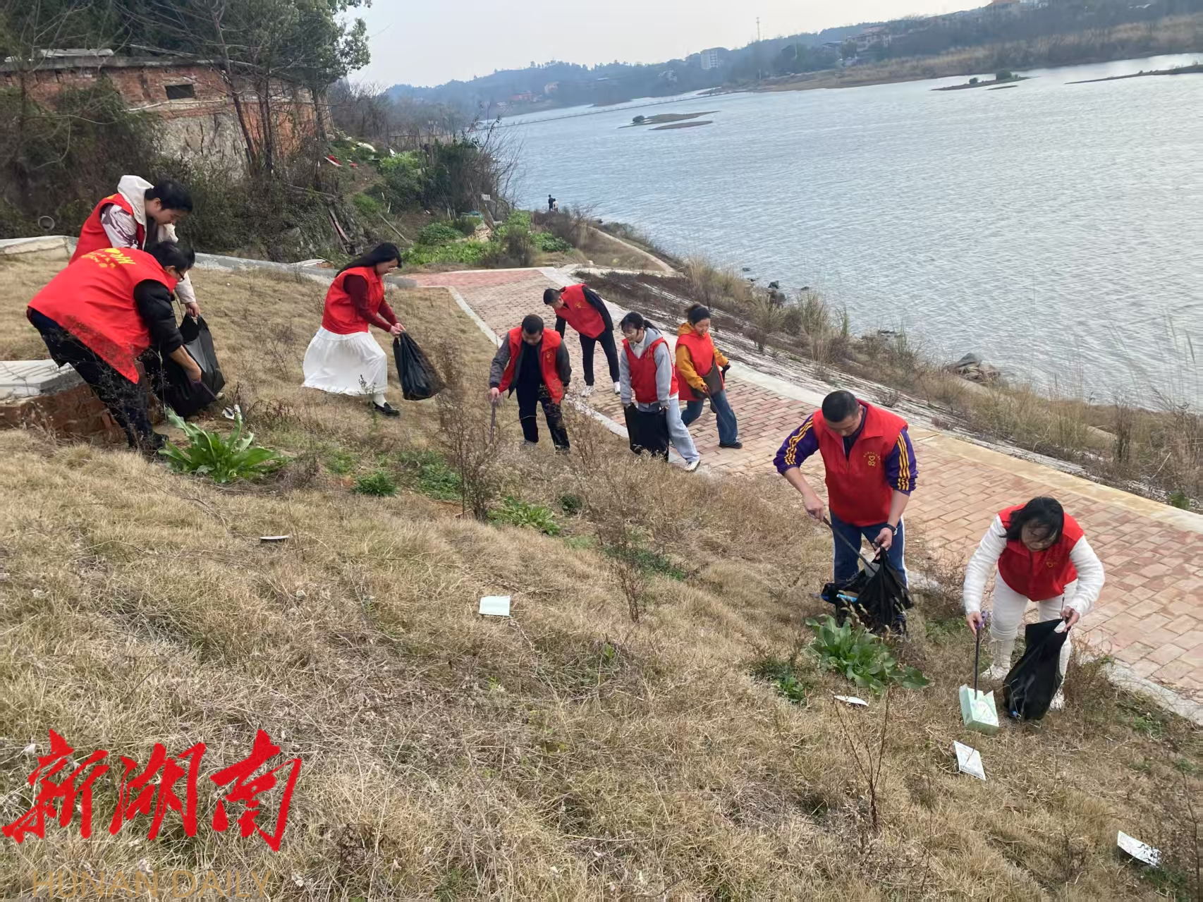 志愿者在潇水河岸拾捡纸屑果皮等垃圾