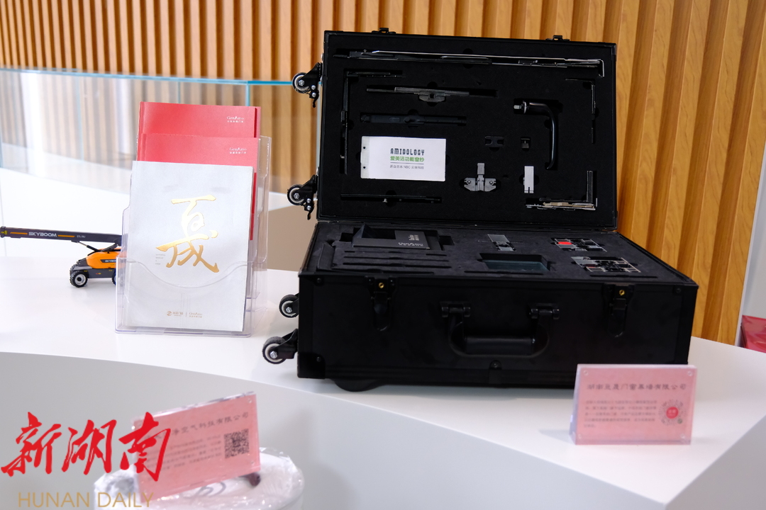 记者走进主题展厅,首先映入眼帘的是一个半开深色产品箱,里面展示了门窗系统的执手、玻璃、五金、隔热条、窗纱等详细构成,该产品来自于园区首位巾帼创新创业导师何海英创办的湖南亘晟门窗幕墙有限公司旗下高端门窗子品牌亘爱系统门窗,其凭借巨幕电影般震撼的视觉效果,已成为现象级网红单品。另外,由女性参与联合创始的国家高新技术企业长沙天盾重工有限责任公司,展出其生产的自行走直臂式高空作业平台模型,线条流畅、细节精致,这些创新成果无不印证着女性视角对产业优化升级的独特价值。